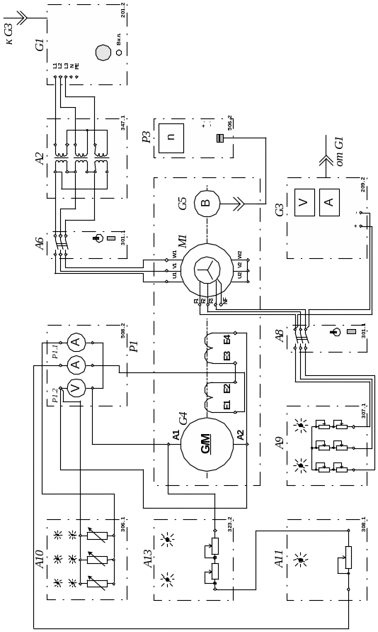 Машина (синхронный двигатель) М1 получает питание от источника G1 через трехфазную трансформаторную группу А2 и выключатель А6 и позволяет снимать требуемые характеристики генератора G4 при постоянстве частоты вращения n.