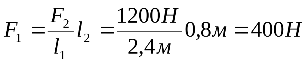 1. С помощью рычага рабочий поднимает плиту массой 120 кг. Какую силу он прикладывает к большему рычага, равному 2,4 м, если меньшее плечо 0,8 м?