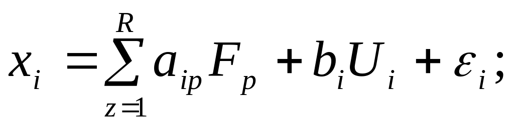 Предполагается, что R<M задано, случайные величины i независимы между собой и с величинами Fp и Ui. Постоянные коэффициенты aip – называются факторными нагрузками (нагрузка i–той переменной на k–й фактор). Значения aip, bi, считаются неизвестными параметрами, подлежащими оценке.