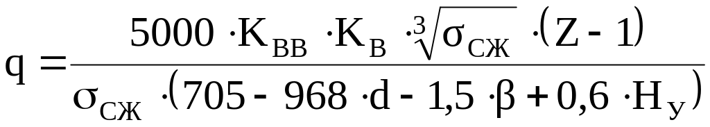 где d – диаметр скважинного заряда (табл. 3.2), м; de – диаметр средней естественной отдельности, м; q – удельный расход ВВ, кг/м3.
