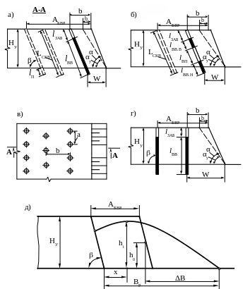Рис. 3.1. Параметры скважинного заряда: а, б – наклонные скважины; в – сетка скважины; г – вертикальные скважины; д – параметры развала; h0 – высота откольной зоны; hi – высота развала в произвольной точке (максимальная); x – отноcительная ширина развала; ΔB – дальность взрывного перемещения породы