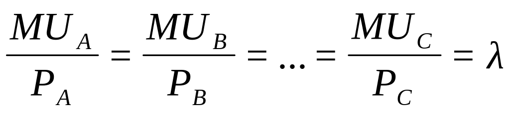 Формулировка условия оптимума потребителя дается во втором законе Госсена. Потребитель достигнет максимума удовлетворения, если он распределит свои средства на покупку различных товаров таким образом, что: