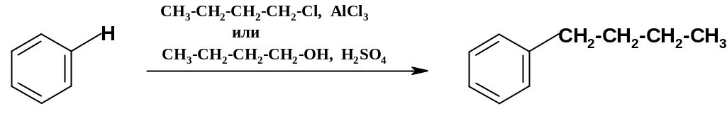 Действительно, таким путем можно получить желаемый продукт. Однако этот вариант связан по крайней мере с двумя сложностями: А. н-Бутильная группа (как и все алкильные группы) является электронодонорной (пусть и в небольшой степени); она ускоряет реакции электрофильного замещения, поэтому вторая н-бутильная группа должна входить в ядро легче, чем первая; реакция имеет тенденцию не останавливаться на стадии образования монозамещенного бензола, а идти дальше. Чтобы главным продуктом реакции все же было монозамещенное производное, необходимо брать заметный избыток бензола. Б. Другим осложнением является изомеризация электрофильной частицы при алкилировании по Фриделю-Крафтсу – карбокатиона: первичный карбокатион склонен перегруппировываться во вторичный; это приводит к получению не целевого продукта, а его изомера – втор-бутилбензола: