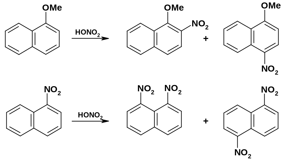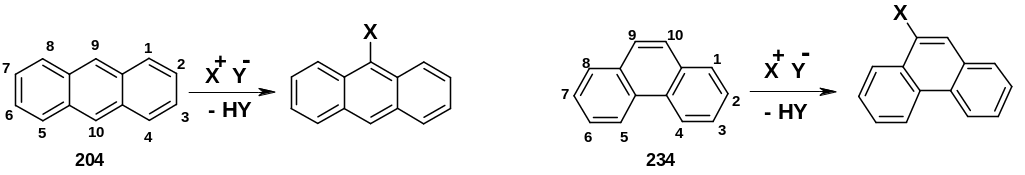 В конденсированных системах – нафталине и, тем более, антрацене и фенантрене – электронная плотность делокализована в несколько меньшей степени, чем в бензоле, поэтому их стабильность несколько меньше. С другой стороны, σ-аддукты не менее устойчивы, чем в реакциях бензола. Поэтому энергия активации для конденсированных систем ниже, чем для бензола; нафталин реагирует с электрофильными реагентами быстрее, чем бензол; антрацен и фенантрен еще легче вступают в электрофильные реакции.