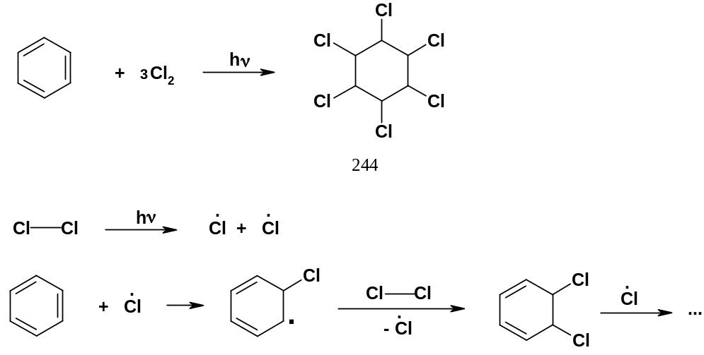 1. Присоединение хлора. При взаимодействии бензола с хлором при интенсивном освещении (на солнечном свету или лучше при УФ-облучении) происходит присоединение трех молекул хлора с образованием гексахлорциклогексана (244). Реакция, как и многие другие, протекающие при освещении, имеет радикальный характер: