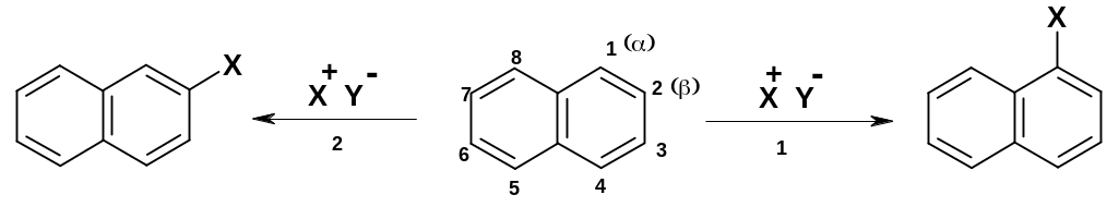 Ранее рассмотренные примеры региоселективности и регионаправленности реакций электрофильного замещения относились к производным бензола. Для конденсированных аренов проблема региоселективности и регионаправленности появляется уже при введении первого заместителя в ядро, поскольку уже в незамещенных конденсированных аренах атомы водорода не эквивалентны.