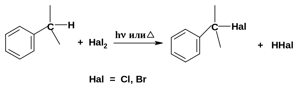 В боковых цепях, связанных с ароматическими ядрами, особую химическую активность проявляет положение, непосредственно связанное с бензольным ядром; оно называется бензильным положением. Причина – активация бензильного положения ароматическим ядром; эта активация происходит потому, что ароматическое ядро стабилизирует переходные состояния и интермедиаты реакций по бензильному положению за счет сопряжения. Такая активация наблюдается для многих типов реакций в зависимости от того, какие атомы связаны с бензильным атомом углерода. Для самих аренов, т.е. углеводородов, бензильное положение активировано чаще всего в радикальных реакциях – аналогично аллильному положению в алкенах (стр. 93). Как и для аллильных реакций, здесь образуется резонансно стабилизированный радикал с делокализованным неспаренным электроном: