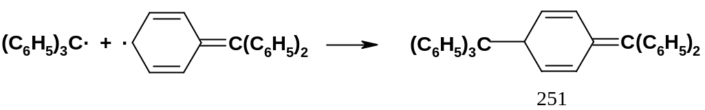 Этот радикал впервые был получен американским химиком М.Гомбергом в 1900 г. при действии серебра на трифенилхлорметан; он явился первым стабильным радикалом. В растворах этот радикал способен к длительному существованию и находится в равновесии со своим димером (продуктом рекомбинации). Некоторые триарилметильные радикалы в растворах вообще не димеризуются. Столь высокая стабильность обусловлена во-первых сопряжением радикального центра с тремя бензольными ядрами, т.е. делокализацией неспаренного электрона по девяти положениям этих ядер; во-вторых, пространственным экранированием радикального центра, что затрудняет рекомбинацию. Роль пространственного экранирования проявляется в том , что при рекомбинации двух трифенилметильных радикалов образуется не гексафенилэтан, а соединение (251):