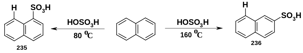 Еще раз напомним: все рассмотренные выше правила ориентации (регионаправленности реакций) относятся к кинетически контролируемым реакциям. При термодинамическом контроле ориентация может быть иной. В качестве примера можно рассмотреть сульфирование нафталина: