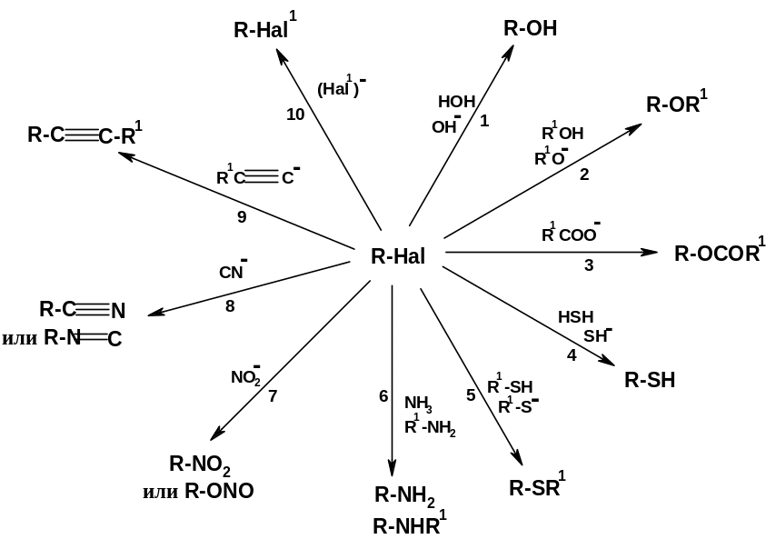 Реакции нуклеофильного замещения атомов галогена открывают огромные возможности как для введения в молекулу различных функциональных групп (функционализации), так и для наращивания и модификации углеродного скелета. Последний аспект будет подробнее раскрыт позднее (при рассмотрении 1,3-дикетонов, малонового и ацетоуксусного эфиров); здесь будут рассмотрены по большей части реакции функционализации.