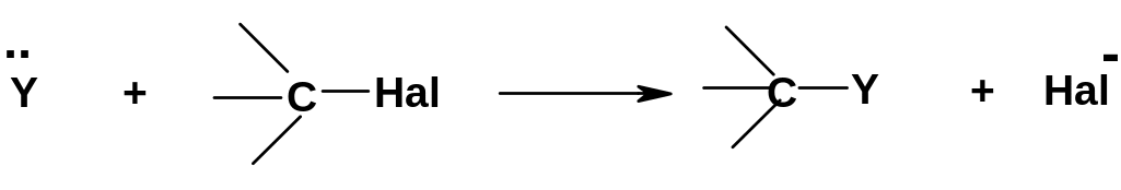 Каждой из двух формальных схем (1 и 2) соответствует свой механизм протекания реакции; таким образом существуют два типовых механизма реакций нуклеофильного замещения при sp3-атоме углерода. Рассмотрим эти механизмы на примере нуклеофильного замещения атомов галогена.