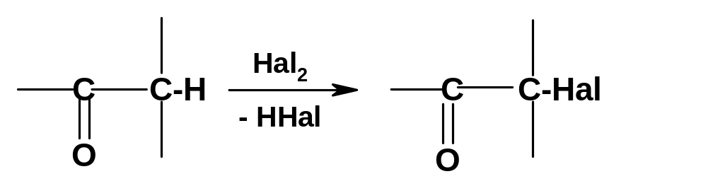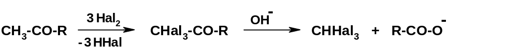 Эта реакция носит название галоформной. Если в качестве галогена использовать иод, то образуется иодоформ СHJ3 – кристаллы желтого цвета, которые легко идентифицировать; поэтому «иодоформная проба» используется для обнаружения метилкетонов.