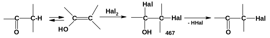 В отличие от замещения водорода на галоген в алканах, аллильном и бензильном положениях, -галогенирование карбонильных соединений идет не по радикальному, а по ионному механизму. Суть реакции – электрофильное присоединение галогена к связи С=С енольной формы карбонильного соединения: