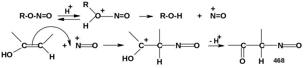 Электрофильной частицей является нитрозоний-катион +N=O, который образуется из нитрита после протонирования и отрыва молекулы спирта.