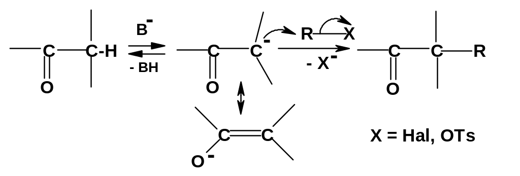 Формальный итог реакции – замещение -атома водорода на алкильную группу R, т.е. -алкилирование карбонильного соединения. Реакции обычно идут по механизму SN2, и амбидентный анион реагирует мягким, т.е. углеродным нуклеофильным центром. Для достижения значительной концентрации енолят-аниона необходимо использовать сильные основания (NH2¯, трет-С4Н9О¯). Проведение алкилирования сталкивается с рядом трудностей: во-первых, с реакцией замещения конкурирует реакция альдольной конденсации; во-вторых, трудно остановить реакцию на стадии моноалкилирования – имеется тенденция к замещению всех (двух или трех) -водородных атомов.