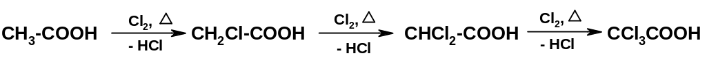 Прямое действие галогенов на алифатические карбоновые кислоты при нагревании или освещении малоселективно; замещаются атомы водорода не только в положении, но и в более удаленных положениях; поэтому оно эффективно только для уксусной кислоты, в которой можно заместить один, два или три атома водорода: