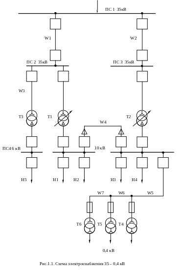 для схемы изображенной на рис.1. спроектировать релейную защиту участка электроснабжения 0,4-35 кВ
