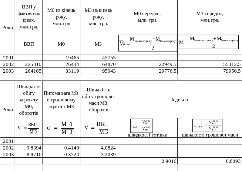 Це означає, що в середньому за 2002 рік готівка здійснила 9,8394 обороти, а у 2003 - 8,8716 оборотів. Швидкість обігу готівки зменшилась на 19,07% (0,8093-1=-0,1907) або на 0,9678 оборотів (9,8394-8,8716=0,9678).