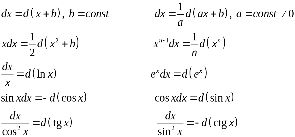 При интегрировании методом подведения под знак дифференциала необходимо иметь в виду следующие равенства: