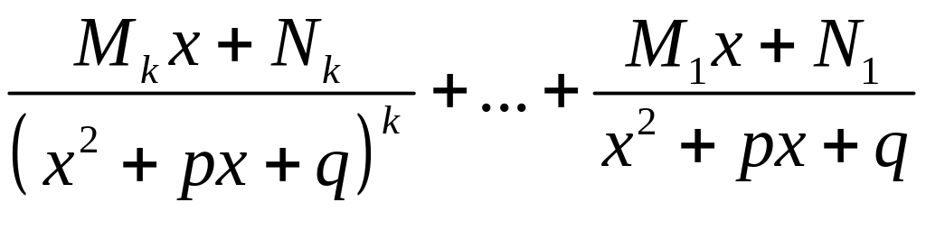 каждой паре комплексно сопряженных корней кратности k соответствует сумма дробей вида
