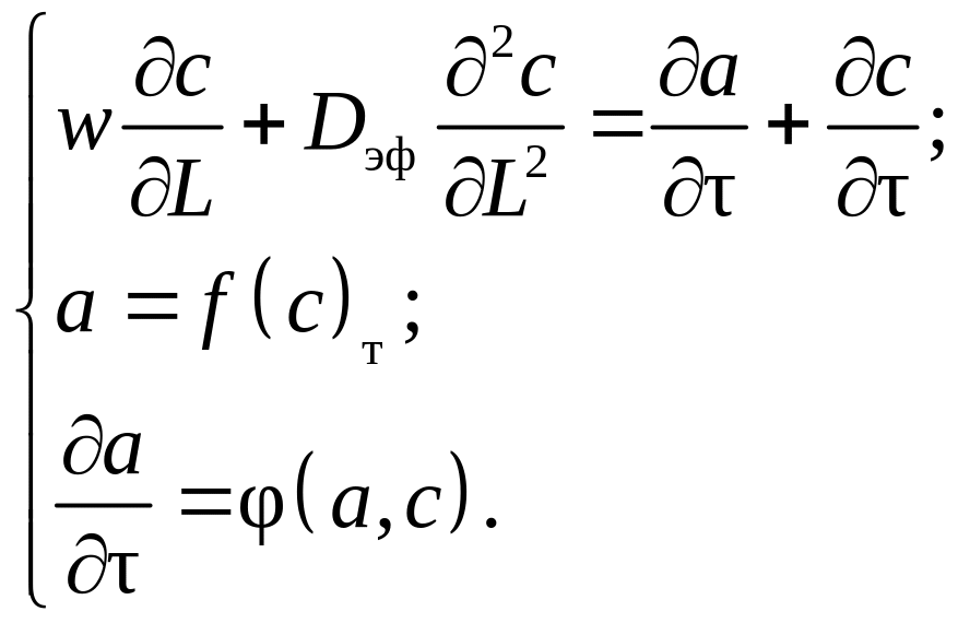 Уравнение (3.11) представляет собой материальный баланс сорбированного вещества: первое слагаемое его левой части выражает перенос вещества с потоком газа, а второе – в результате продольной диффузии. Правая часть этого уравнения передаёт прирост концентрации и количества сорбированного вещества. Уравнение (3.12) этой системы задает форму изотермы, а уравнение (3.13) передает кинетику сорбционного процесса.