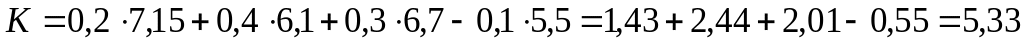 Визначивши комплексні показники оцінки перспектив зростання попиту, зміни рентабельності, можливостей (успіху) і загроз (нестабільності) визначимо комплексний показник привабливості сфери діяльності підприємства (К) за формулою 4.1.