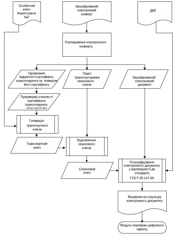 виконується розшифрування електронного документу за допомогою алгоритму, що визначається стандартом ГОСТ 28.147-89, який використовує зашифрований електронний документ, сеансовий ключ та ДКЕ;