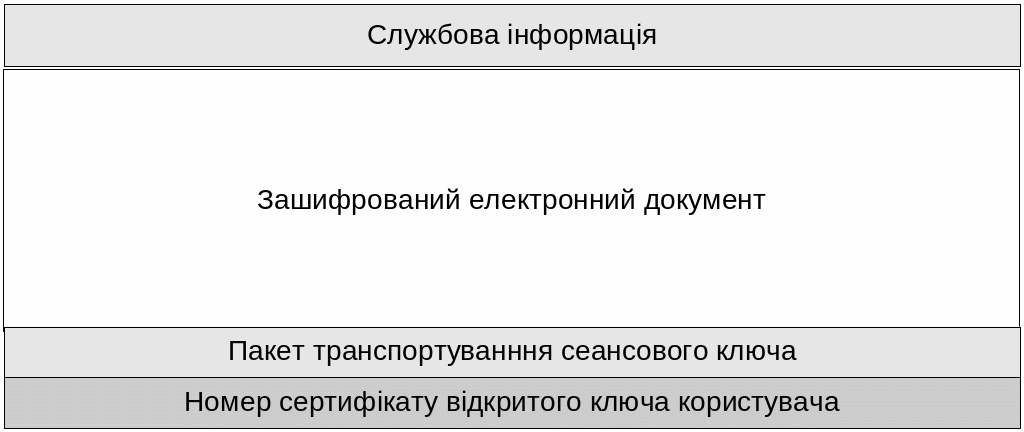 формується електронний конверт спеціального формату (Мал.5), до складу якого входить зашифрований електронний документ, пакет транспортування сеансового ключа та номер сертифікату відкритого ключа користувача.