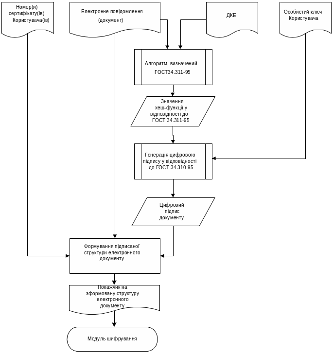 генерується цифровий підпис у відповідності з алгоритмом, що визначається стандартом ГОСТ 34.310-95, якій використовує значення хеш-функції повідомлення (документа) та особистий ключ користувача;