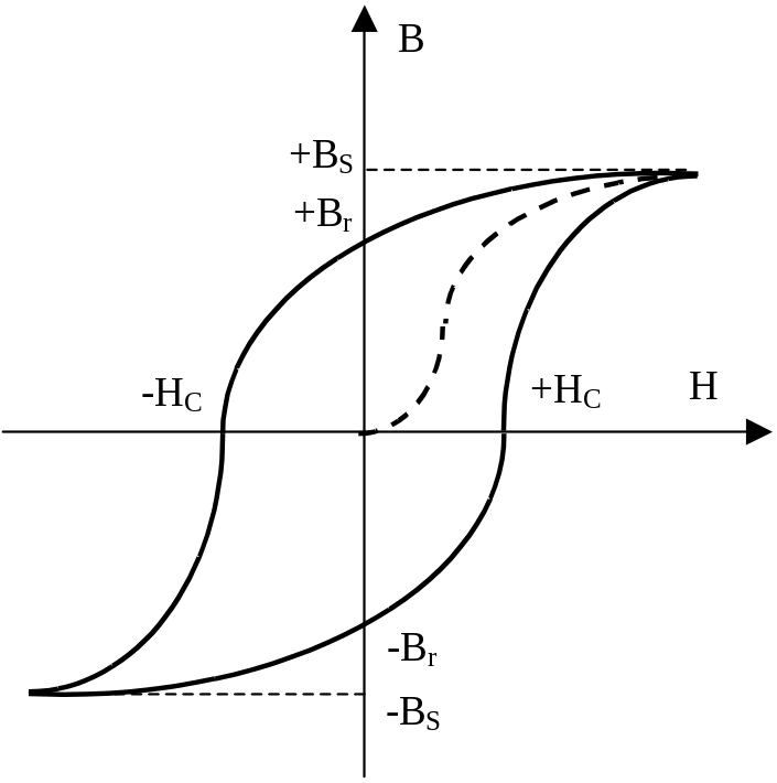 матеріалу від напруженості магнітного поля Н. У феромагнітному матеріалі в стані спокою магнітні домени є невпорядкованими, випадково поскладаними у різному порядку. В цілому об’ємі їх сумарна магнітна дія компенсується. Коли уводиться зовнішнє магнітне поле, молекулярні магнітні домени повернуться в такому напрямку, щоб він був ідентичний з магнітним потоком. Чим вища є напруженість магнітного поля Н, тим більше магнітних доменів буде в такий спосіб повернуто. Коли всі частки, тобто магнітні домени будуть скеровані в тому самому напрямку, матеріал увійде в стан насичення ВS і не можна буде досягнути більшої індукції (густоти потоку), навіть тоді, коли додатково збільшити напруженість магнітного поля Н. Коли зменшити напруженість магнітного поля, то магнітна крива не повертається попереднім шляхом, оскільки частина магнітних доменів не повертається до свого попереднього положення. Коли напруженість магнітного поля дорівнює нулеві Н=0, то надалі існує певний потік в матеріалі. Ця індукція називається залишковою магнітною індукцією Вr. З метою зведення магнітного потоку в осерді до нуля, слід створити напруженість магнітного поля, скеровану в протилежному напрямку. Ця напруженість магнітного поля називається коерцитивною силою НС.