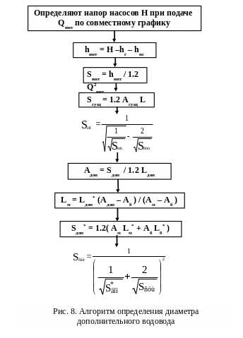 Обозначения к рис. 8: Н – напор насосов; hг – геометрическая высота подъема; hнс – потери напора в НС; Sинт – сопротивление системы после реконструкции; hинт – потери в системе водоводов после реконструкции; Qинт – расход интенсификации; Aдоп – удельное сопротивление дополнительного водовода; Sдоп - сопротивление дополнительного водовода; Lдоп – длина дополнительного водовода; Sсущ – сопротивление существующего водовода; Aсущ – удельное сопротивление существующего водовода; L – длина существующего водовода; Aм Lм* , Aб Lб* - удельное сопротивление и длина соответственно меньшего и большего диаметра дополнительного в случае телескопического водовода.