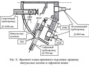 2. Строительство сифонной линии диаметром восходящей ветви 700 мм, нисходящей 600 мм. Сифонная линия заводится в сеточное отделение берегового колодца, в котором размещаются импульсная колонна и затвор (рис. 9). Трубопровод обратной промывки подключается к импульсным колоннам в наземном павильоне НС. Рекомендуется обратная промывка подающих линий с периодической импульсной промывкой оголовков.