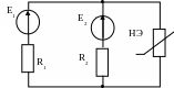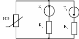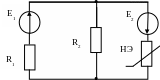R1=2 кОм; R2=1 кОм, Е1=2 В, E2=3 В. ВАХ НЭ известна. Рассчитать ток, протекающий через НЭ. |