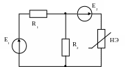 R1= R2=1 кОм; Е1= E2=2 В; ВАХ НЭ известна. Рассчитать ток, протекающий через НЭ. |
