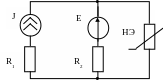 R1= R2=1 кОм; Е=2 В, J=4 мА; ВАХ НЭ известна. Рассчитать ток, протекающий через НЭ. |