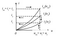 При параллельном соединении двух нелинейных сопротивлений суммируются зависимости i1(u1) и i2(u2) для получения ВАХ iвх(uвх) нелинейного сопротивления, которым можно заменить исследуемый участок цепи (Рис. 3.2).