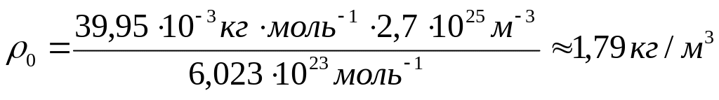 Решение. Плотность ρ0 аргона определим, умножив массу т0 одной молекулы на постоянную Лошмидта NЛ: 0= т0NЛ. Так как т0=MAr/NA, то