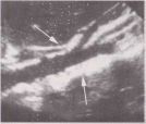 Рис. 32. Ультразвуковое исследование брюшной аорты в В-режиме. Стрелками обозначено резкое утолщение стенок вокруг торакоабдоминального отдела аорты. Выраженный перипроцесс вокруг верхней брыжеечной артерии с сохранением ее просвета.