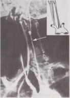 Рис. 36. Ангиограмма больной М., 34 лет. Стрелкой обозначена окклюзия брахиоцефального ствола, окклюзия правой и левой подключичных артерий и правой общей сонной артерии. Кровоснабжение головного мозга осуществляется за счет левой сонной и позвоночной артерий.