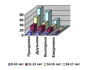 На фоне рассмотренных общих оценок алкоголизации учащимися представляет интерес вопрос о том, в каких ситуациях, в каких пределах они считают допустимым собственное употребление спиртных напитков (рис. 4). Из иллюстрации видно, что число девочек 16-17 лет, положительно оценивающих употребление алкогольных напитков по праздникам, превосходило соответствующие показатели у мальчиков, их сверстников (t=2,3).