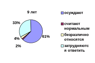 Тот факт, что дети из семей, соблюдающих "сухой закон", по отношению к детям из семей, не соблюдающих его, менее осуждали пьянство (t=3,4) и чаще встречали затруднения в его квалификации (t=3,8), возможно, объясняется отсутствием в их семьях "алкогольной практики". Наибольшая частота квалификации пьянства как нормального явления встречалась в семьях с преимущественным употреблением спиртных напитков по выходным дням, что, возможно, являлось следствием своеобразной адаптации детей к семейным выпивкам, еще не достигшим уровня асоциальности, как в семьях с ежедневным потреблением, где этот показатель наименьший (t==2,1). Дети из семей с ежедневным употреблением спиртных напитков, так же, как и дети из семей, соблюдающих "сухой закон", имели равные показатели безразличного отношения к проблеме пьянства (t=1,3).