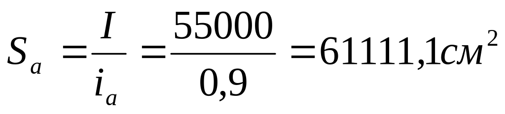Зная силу тока (55кА) и анодную плотность тока (0,9 А/см2) по данным практики, определим площадь анода, см2:
