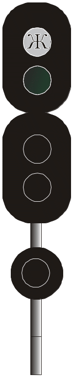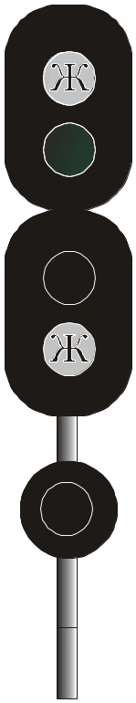 два желтых огня — “Разрешается проследование светофора с уменьшенной скоростью и готовностью остановиться у следующего светофора; поезд следует с отклонением по стрелочному переводу”;