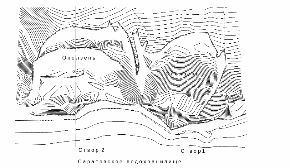 Перепады высот уровня воды в водохранилище (сезонные и ежесуточные) препятствуют установлению динамического равновесия склонов. В этих условиях не происходит формирования пологой и широкой отмели, что способствует интенсивной переработке береговой линии. Данный процесс продолжается уже более 40 лет и имеет тенденцию к дальнейшему развитию. Активизация оползневых процессов древних оползневых тел наступила практически сразу после заполнения Саратовского водохранилища.