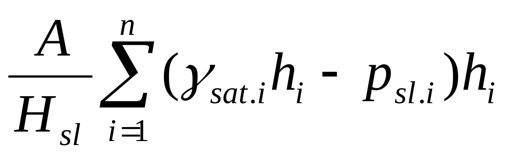 где А – площадь взаимодействующего со сваей окружающего грунта природной структуры; γsat.i - удельный вес грунта в водонасыщенном состоянии; ni - толщина i-го слоя, на которое разбита толща просадочного грунта Нsl, в пределах которой проявляются силы нагружающего трения; psl.i - начальное просадочное давление i-го слоя грунта.