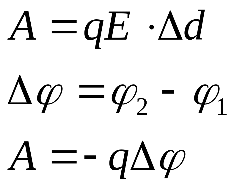А – работа однородного поля по перемещению заряда между двумя точками; q – модуль перемещаемого заряда; Е – напряженность однородного поля; Δd – расстояние между точками поля, измеренное вдоль линий напряжённости. |