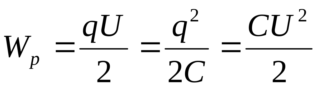 Wp– энергия электрического поля заряженного конденсатора; q – модуль заряда одной из обкладок; U – напряжение между обкладками; С – электроёмкость конденсатора. |