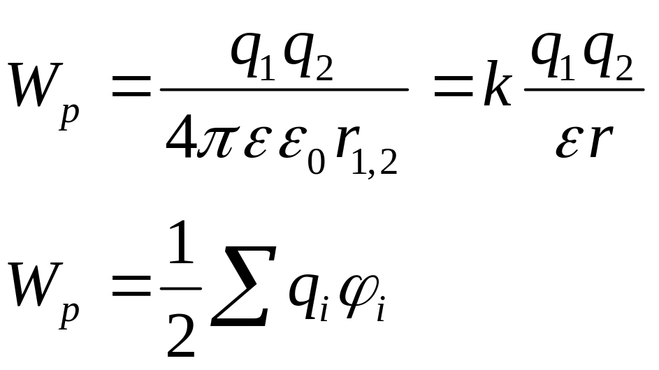 Wp.– энергия взаимодействия двух точечных зарядов; qi – заряд первого тела; q2 – заряд второго тела; г,,2 – расстояние между телами. |