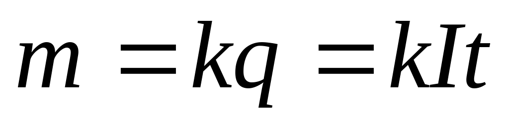 m – масса выделившегося на электроде вещества; k – электрохимический эквивалент; q – заряд, прошедший через электролит; I – сила тока через электролит; t – время прохождения тока. |