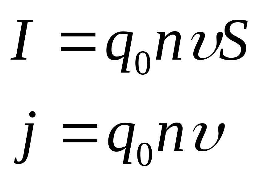 I – сила тока в проводнике; q0 – заряд свободного носителя заряда; n – концентрация носителей заряда; – средняя скорость упорядоченного движения носителей заряда; S – площадь поперечного сечения проводника; j – плотность тока. |